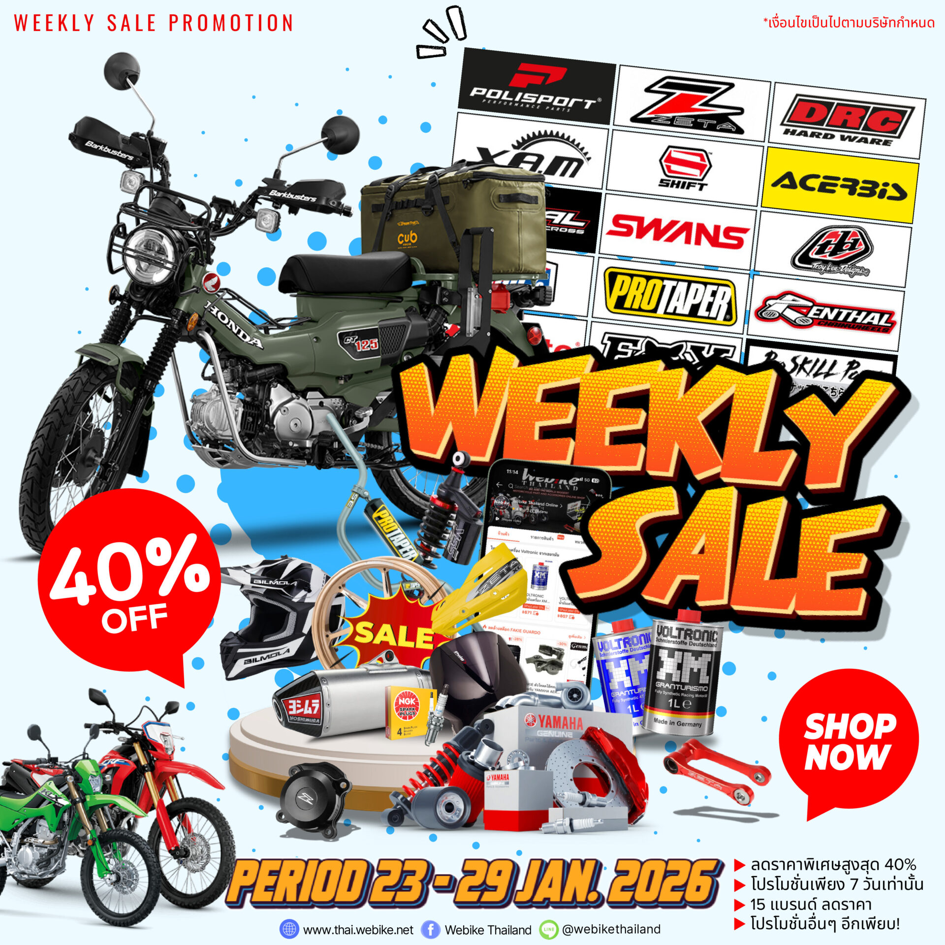 เตรียมตัวให้พร้อมสำหรับสัปดาห์แห่งการช้อป! Webike Thailand ผู้นำด้านอะไหล่และอุปกรณ์แต่งรถจักรยานยนต์ออนไลน์ ประกาศเปิดตัวแคมเปญ "Weekly Sale Promotion" ประจำวันที่ 23 - 29 มกราคม 2026 ขนไอเทมเด็ดจากแบรนด์ชั้นนำทั่วโลกมาลดราคาสูงสุดถึง 40% เอาใจทั้งสายลุย สายสปอร์ต และสายทัวร์ริ่งแบบจัดเต็ม