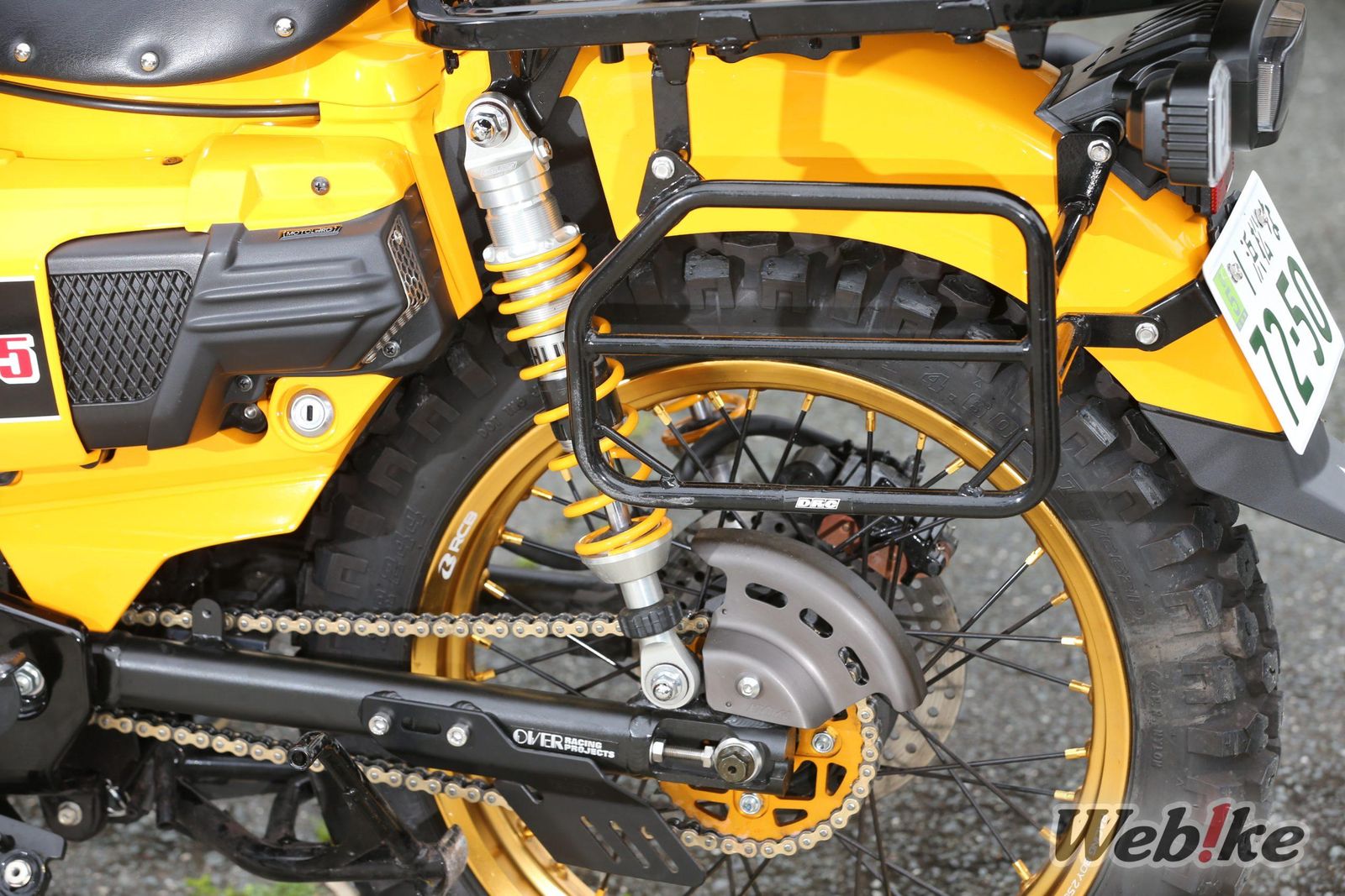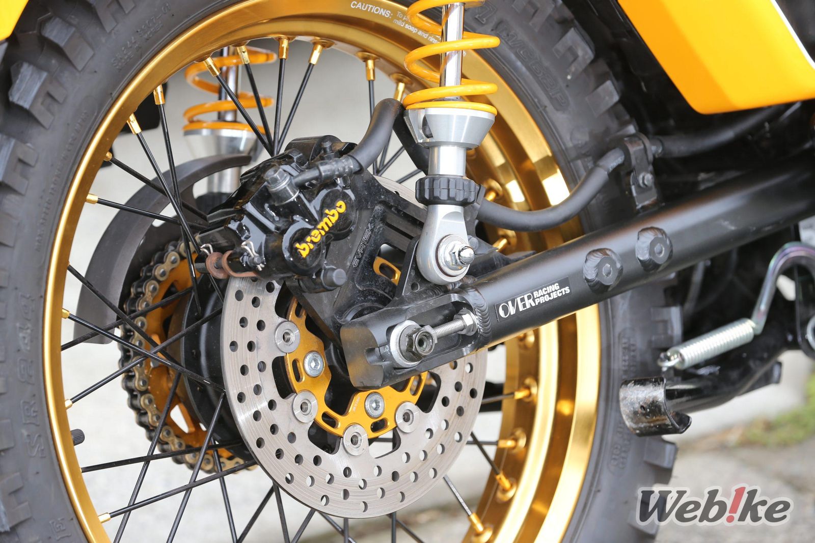 สวิงอาร์มเป็นแบบ OVER Racing Type 6 เคลือบสี GUN-KOTE สีดำ ให้ความรู้สึกออฟโรดอย่างแท้จริง ระบบกันสะเทือนหลังเป็นแบบเดียวกับด้านหน้า มาพร้อมโช้ค Ohlins HO029