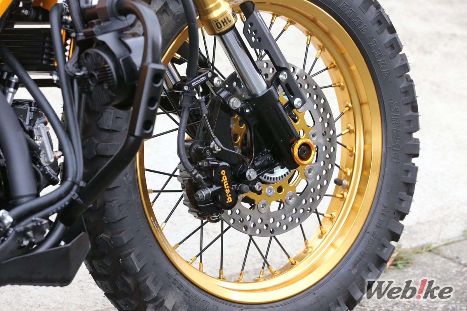 ล้ออลูมิเนียม RCB 2.50 ด้านหน้าและด้านหลัง ประกอบกับยาง SHINKO SR244 (4.60-17) ช่วยให้จักรยานดูทรงพลังและมีรูปลักษณ์คล้ายรถเทรล