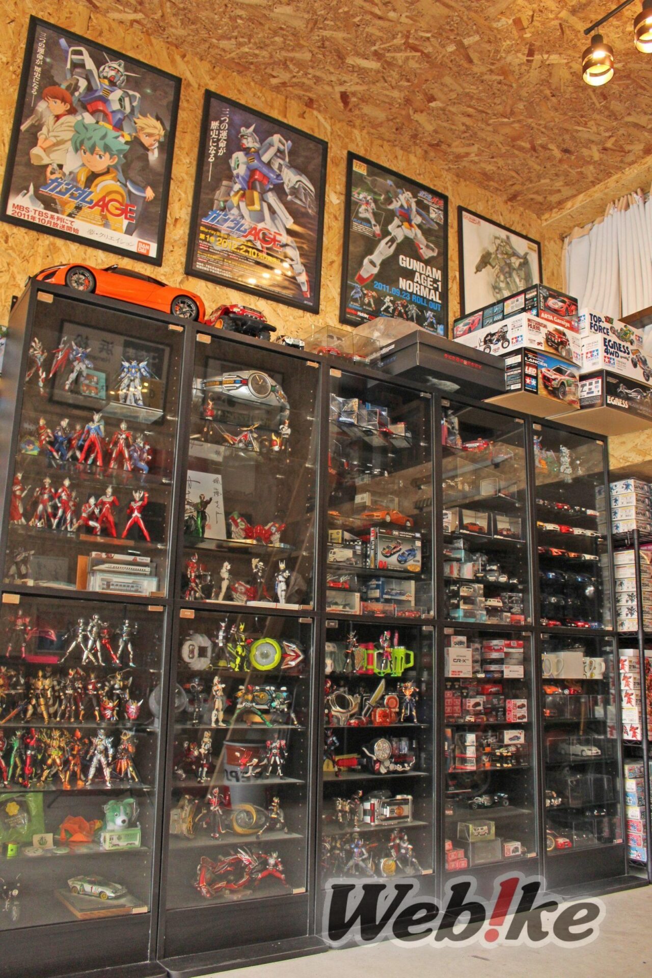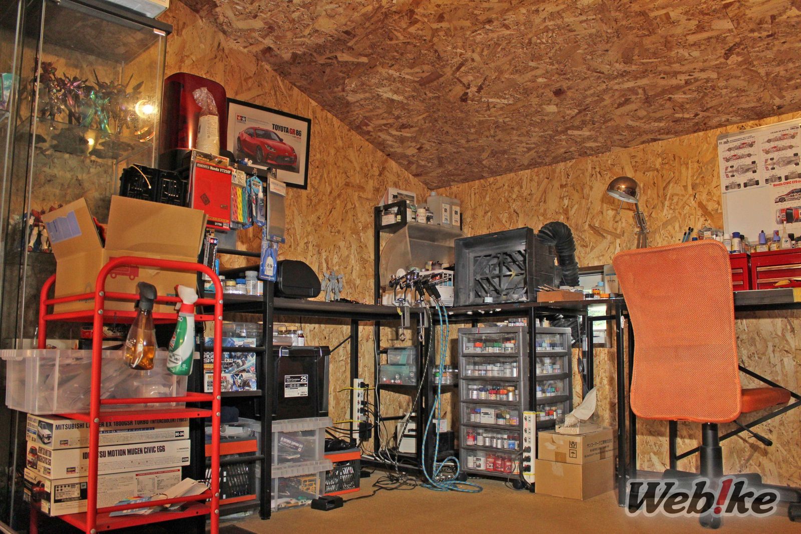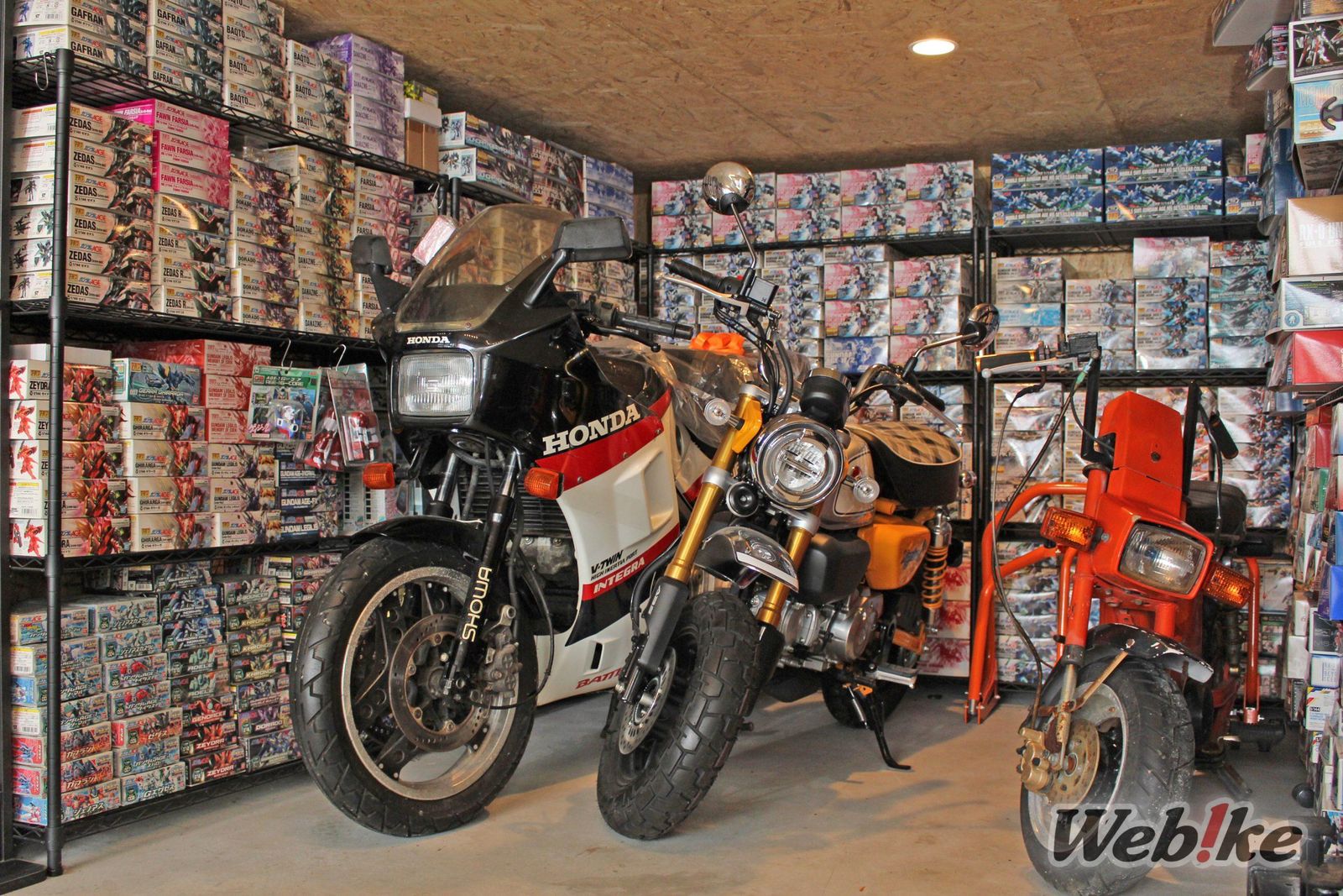 ที่โรงรถบ้านของเขา พร้อมห้องใต้หลังคา ด้านหลังมีรถ VT250F, Monkey 125, Chaly และโมเดลจำลองขนาดใหญ่
