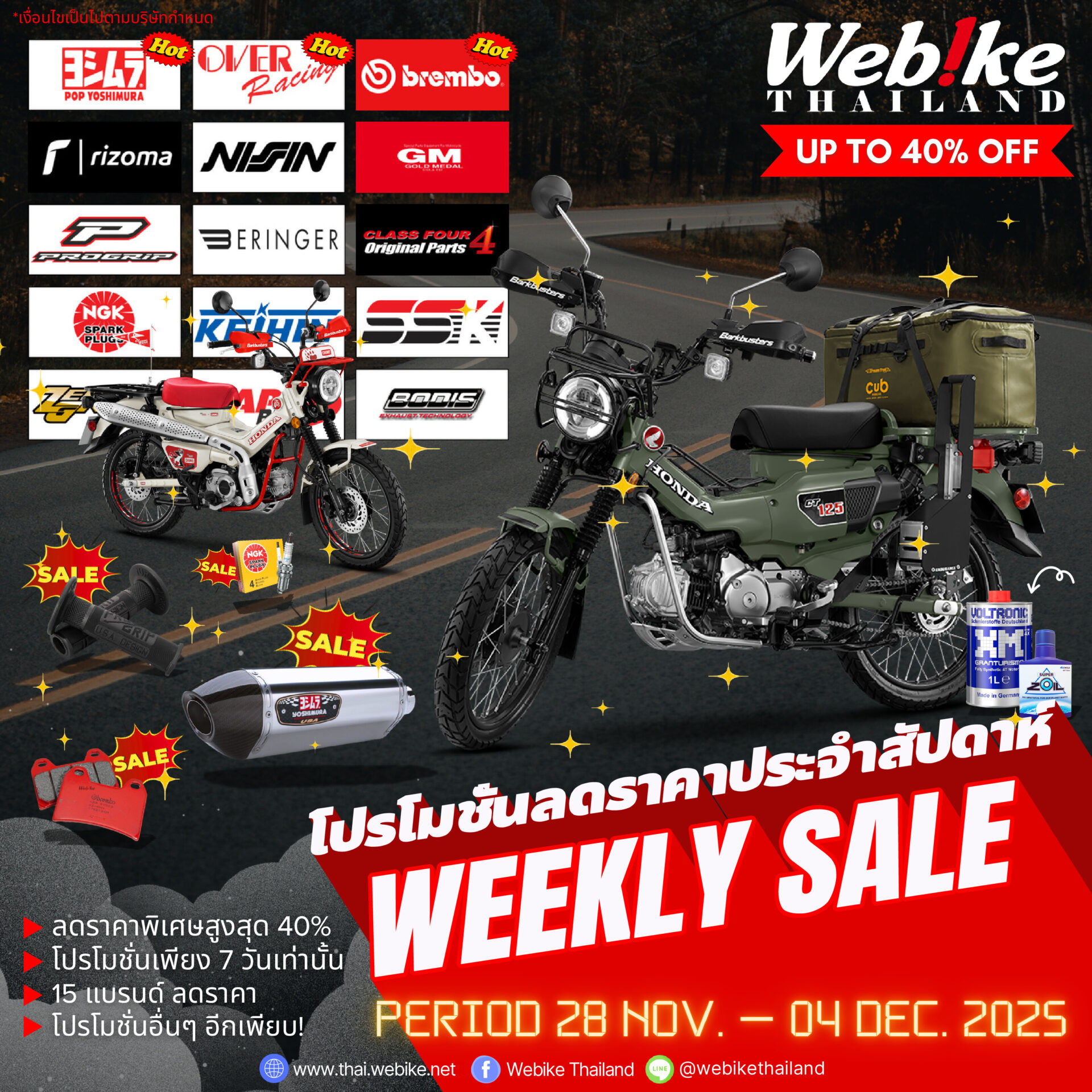 โปรโมชั่นประจำสัปดาห์ Webike คือโอกาสทองที่ผู้ขับขี่รถจักรยานยนต์ทุกคนไม่ควรพลาด! Webike Thailand ขนทัพอะไหล่แต่งและอุปกรณ์เสริมคุณภาพสูงจากแบรนด์ชั้นนำระดับโลกกว่า 15 แบรนด์ มาให้คุณได้เลือกช้อปในราคาที่ถูกที่สุดในรอบปี ลดกระหน่ำสูงสุดถึง 40%! พิเศษสุดๆ กับโปรโมชั่นระยะเวลาจำกัดเพียง 7 วันเท่านั้น!