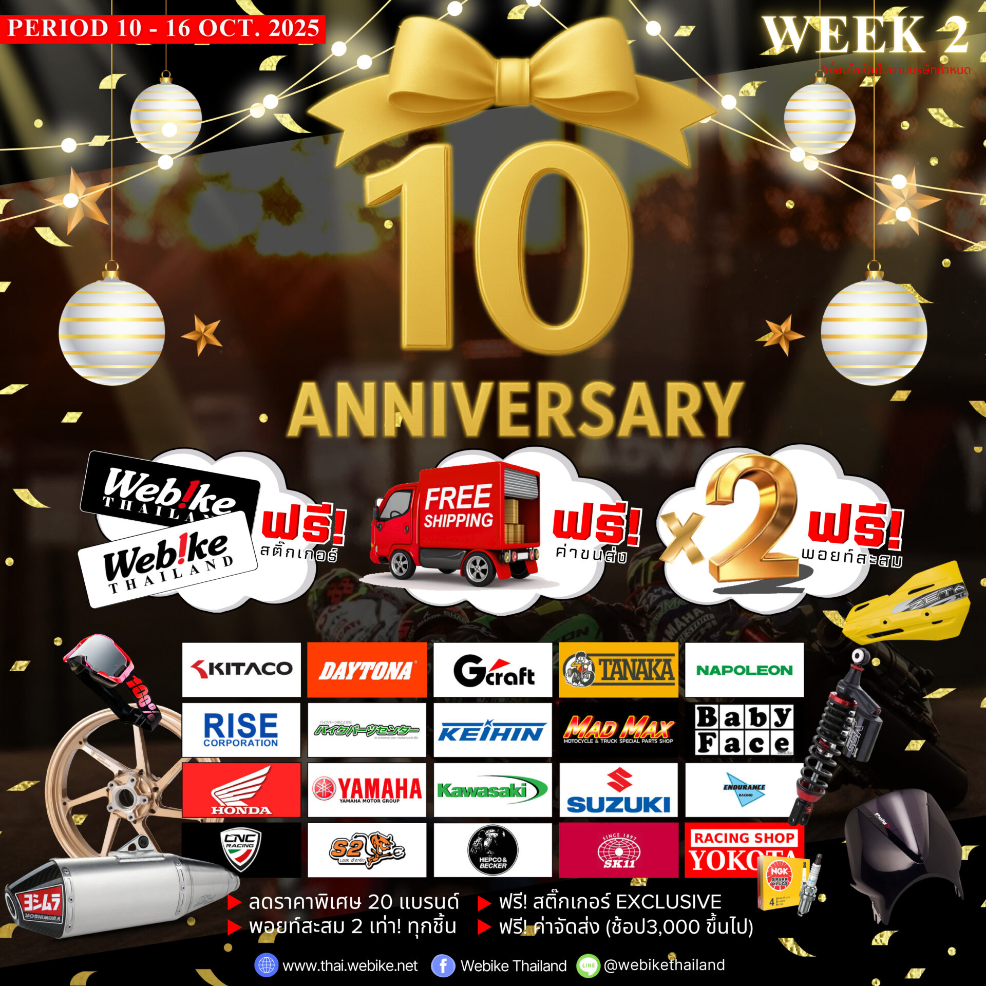 หลังจากสัปดาห์แรกได้รับเสียงตอบรับอย่างล้นหลามจากเหล่าสายซิ่งทั่วประเทศ Webike ไม่หยุดเฉลิมฉลอง และขยายความพิเศษต่อเนื่องให้ทุกคนได้สนุกกับการช้อปอะไหล่แต่งรถมอเตอร์ไซค์ในราคาสุดคุ้ม พร้อม สิทธิ์ “ส่งฟรีทั่วไทย” และ “พอยต์คูณ 2” เพื่อขอบคุณลูกค้าทุกท่านที่อยู่เคียงข้างมาตลอด 10 ปีเต็ม!